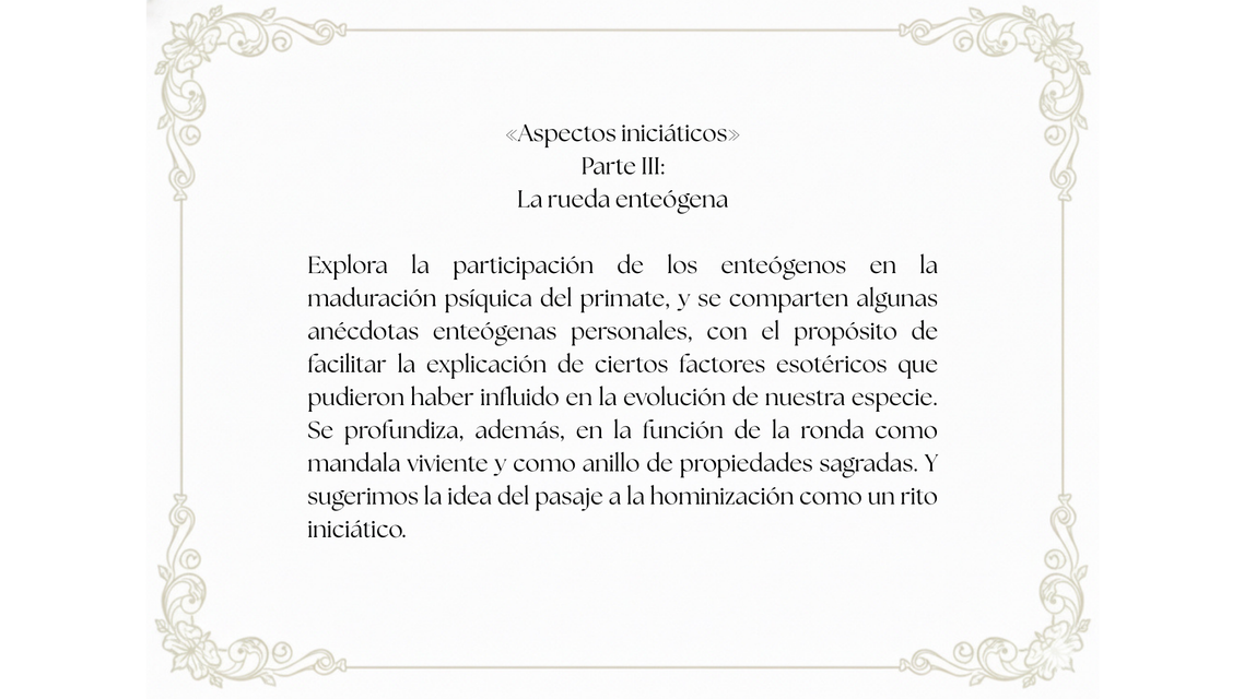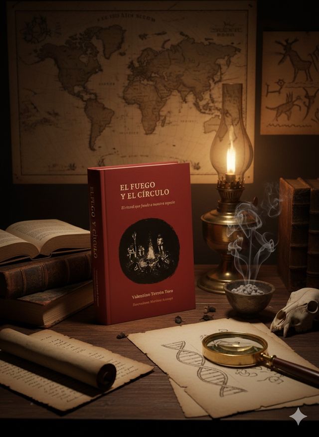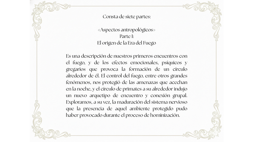 La idea antropológica fundamental de esta obra es la siguiente: cuando nuestros ancestros desarrollaron la capacidad de controlar el fuego se activó de forma espontánea y sincrónica un símbolo sagrado por excelencia: el círculo. Así, aquel ambiente primitivo quedó atravesado por la siguiente imagen: una ronda de primates alrededor de un fuego moderado.