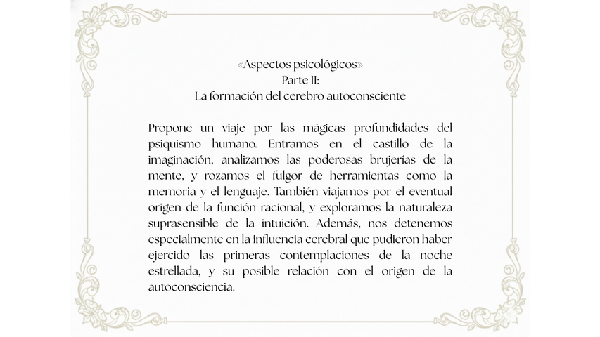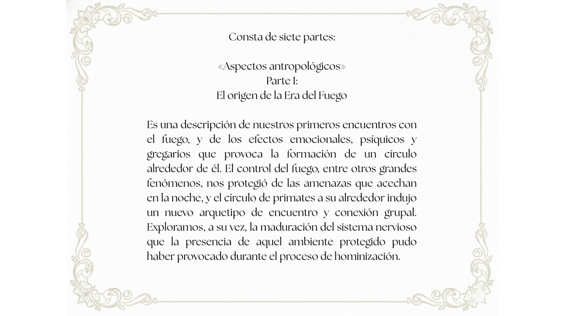El punto de partida son las épocas arcaicas. Los tiempos en que éramos un linaje de primates todavía híbridos en nuestra forma de vivir: por momentos arriba de los árboles; por momentos abajo, al lado del fuego. Es la historia de cómo ese grupo de animales salvajes fue recorriendo un camino iniciático: el camino de expansión de consciencia que los condujo hacia su condición de Homo sapiens. Y la historia no concluye aquí, continúa su curso hacia el despliegue de la inteligencia afectiva y la sabiduría vincular, cuyo triunfo constituye la llave dorada para reparar la herida ecológica del planeta.