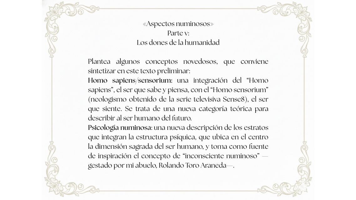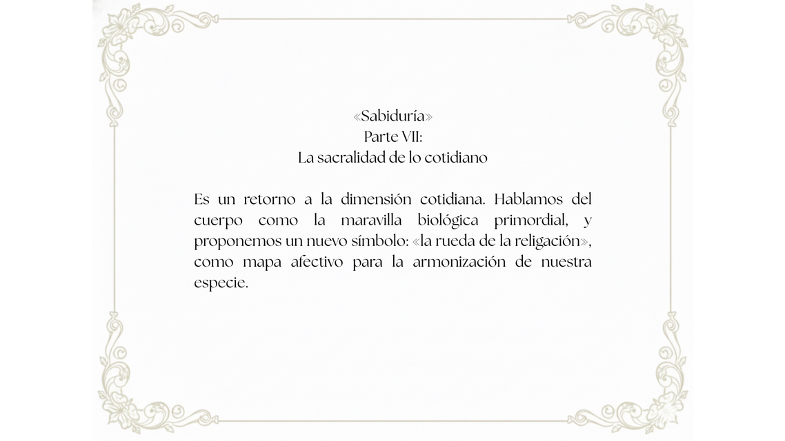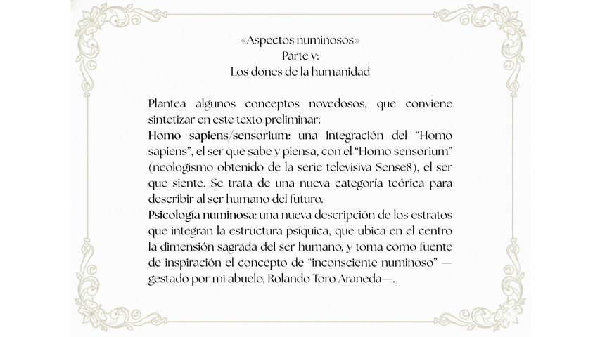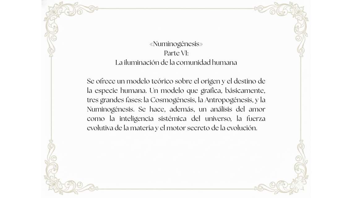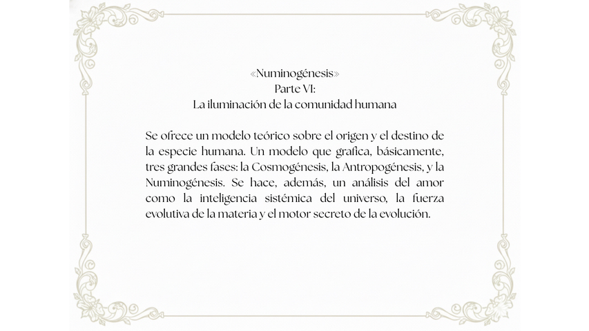 Esta obra formula una nueva visión antropológica sobre el origen y la función del Homo sapiens en la Tierra. Al parecer, el Homo sapiens es la primera criatura que puede establecer un contacto pleno y consciente con la dimensión sagrada de todo lo existente. Es un animal que porta el talento para despertar aquello que se presenta como un triunfo espiritual en la evolución biológica: la capacidad de amar el milagro de la vida.