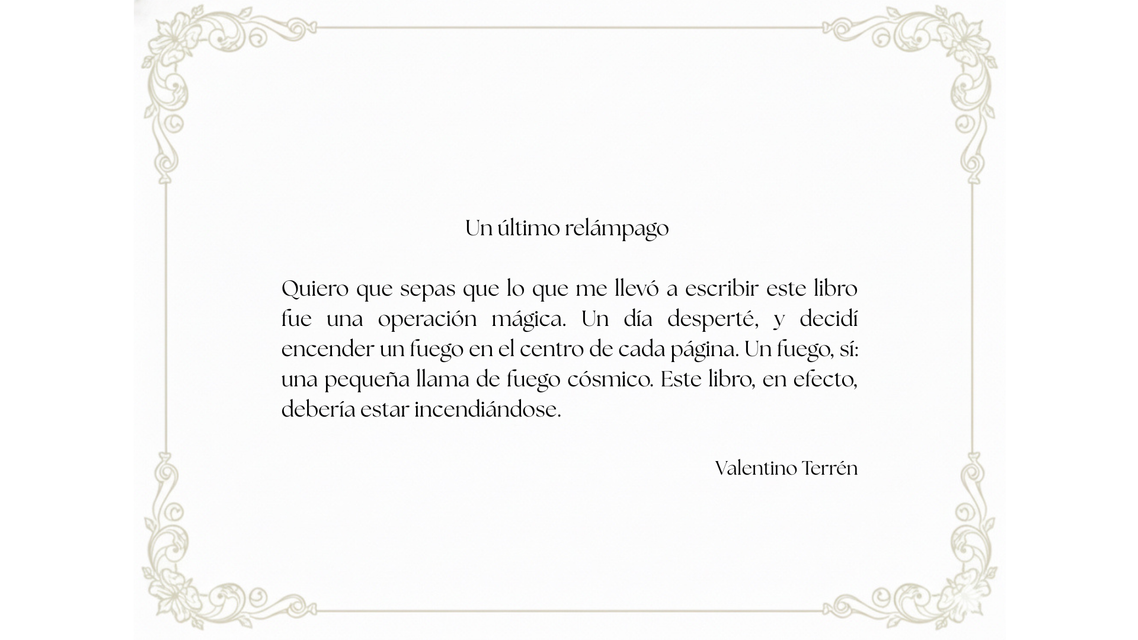 Un último relámpago: quiero que sepas que lo que me llevó a escribir este libro fue una operación mágica. Un día desperté, y decidí encender un fuego en el centro de cada página. Un fuego, sí: una pequeña llama de fuego cósmico. Este libro, en efecto, debería estar incendiándose.